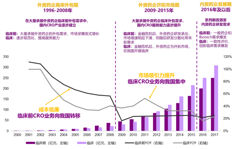 (1)萌芽起步期(1996-2008年):外资与合资CRO垄断中国市场,同时国内龙头相继成立,开始大量承接外资药企临床前外包需求, 并逐步规范化。