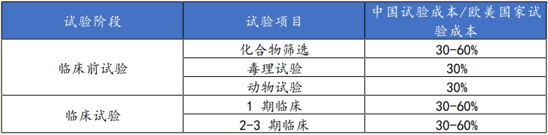 在临床前试验阶段,我国化合物筛选成本占发达国家成本的30-60%、毒理试验和动物实验也均占30%。同时,在临床CRO阶段,我国拥有庞大的患者人群和丰富的疾病谱,且成本优势显著,在中国进行CRO试验(I至III期)的成本分别是发达国家的30%-60%。