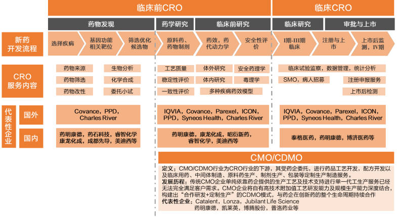 随着外包服务需求增加,产业链延伸到CMO/CDMO(合同生产组织)、CSO(合同销售组织),这些外包服务务贯穿整个药品生命周期。