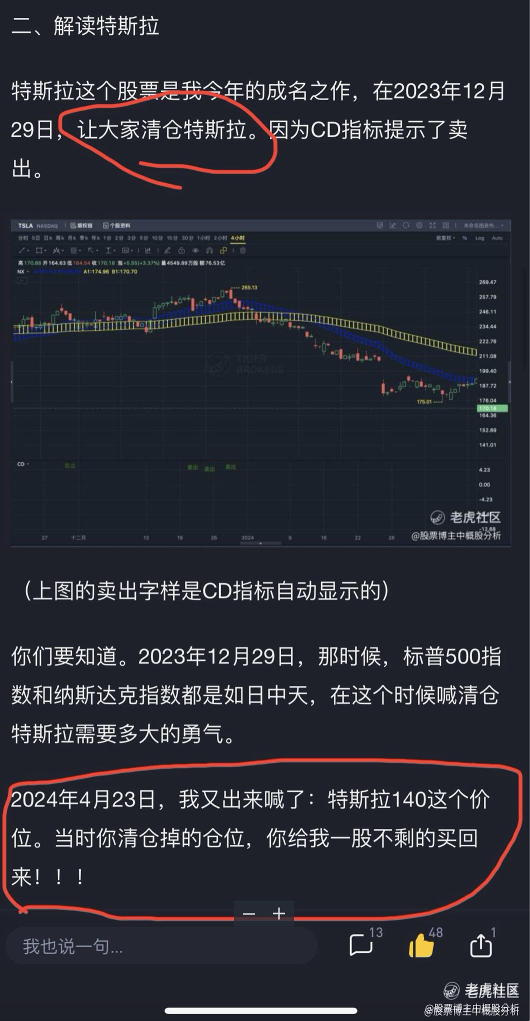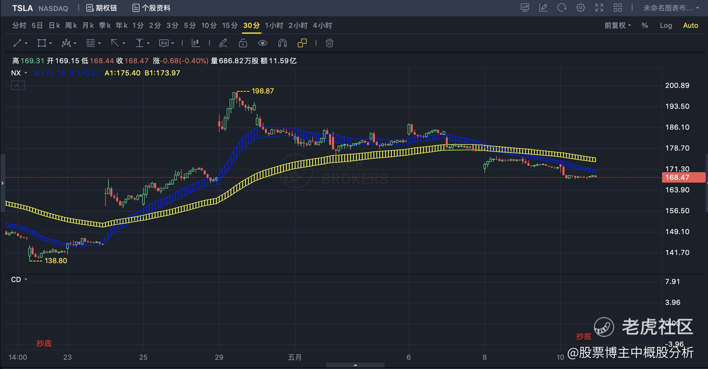 去年12月29日,我让大家清仓特斯拉。因为CD指标提示了卖出,然后到了4月22日,我对140这个价格兴奋到极致。但是今天我想聊的是,上一次CD指标在140这里提示了抄底,还没上车的小伙伴,可以留意,这周又可以加仓了。因为CD指标又出了一个抄底.