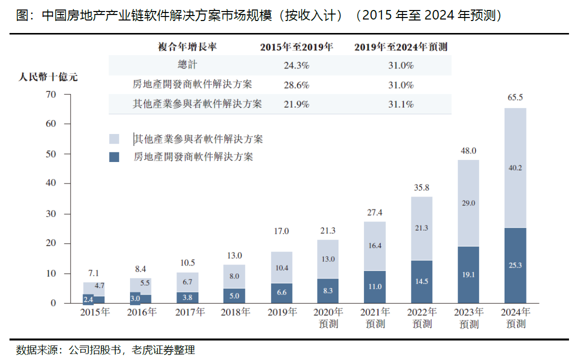 同时,房地产SaaS市场增速显著快于本地部署。据弗若斯特沙利文预测,SaaS及本地部署市场规模19-24E CAGR分别为49%/16%。2019年SaaS产品和ERP解决方案的市场规模分别为21亿元和44亿元,**国房地产开发商软件解决方案市场规模的32%和68%;而 2024年这一市场规模将分别增长至159亿元和94亿元,SaaS产品比例将扩大至63%。