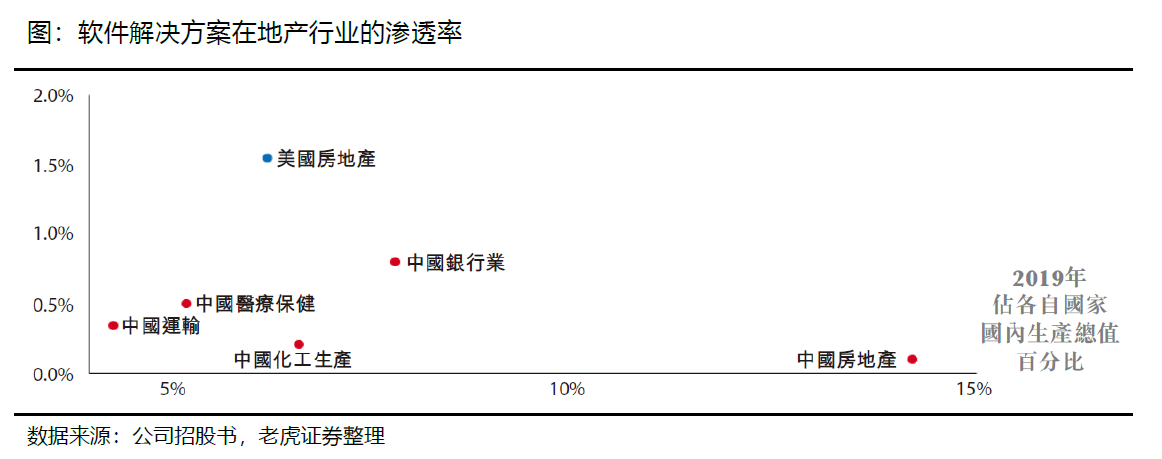 行业环境:房地产业务的数字化发展潜力巨大。2019年中国房地产产业链的软件解决方案市场渗透率只有0.1%,远低于美国的1.55%。