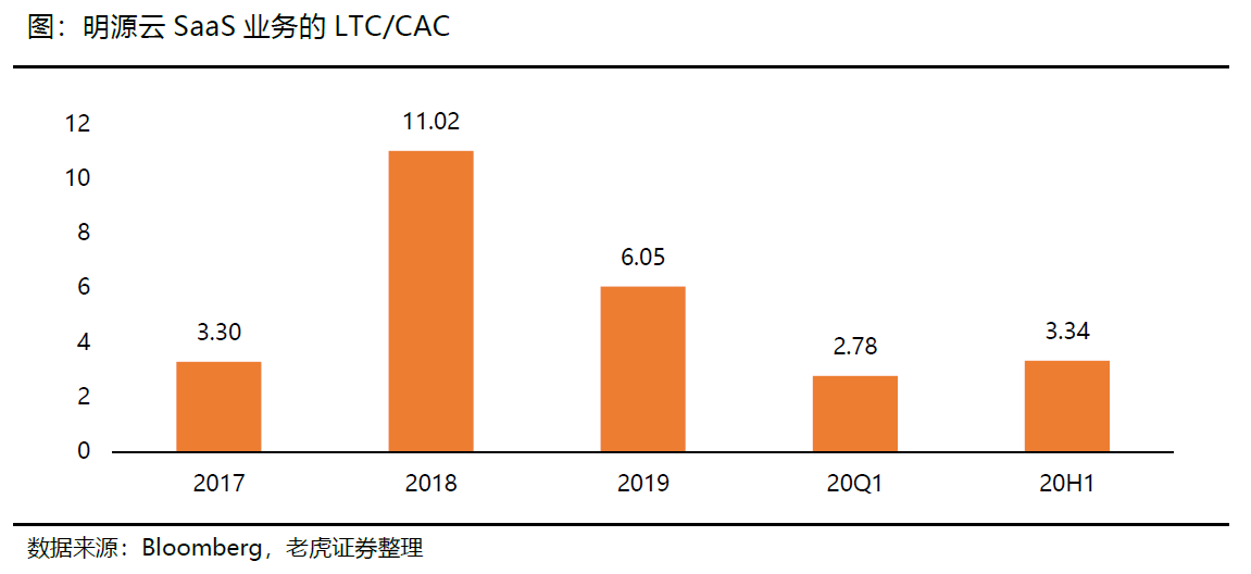 根据公司披露,明源云的客户留存率在2019年之后就稳定在96%,假设未来能保持在95%的水平上,并且我们将所有的营销费用都计入SaaS,则明源云的LTV / CAC在2018年和2019年分别为11.02和6.05,说明在获取新客户方面的实力强大,而即便2020年SaaS的收入水平上市,公司SaaS的销售成本和营销费用增大,依然在2020年上半年保持在3.0以上的水准。(一般良好基准是 3:1,优秀的标准是4:1,5:1是伟大)。估值及目标