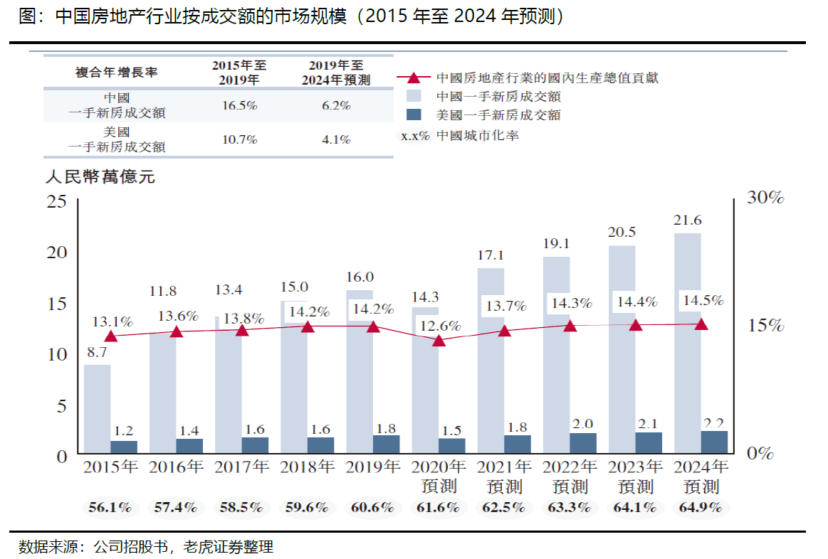 首先,中国房地产行业体量巨大。2019年新房交易额达到16万亿元,预计到2024年将以6.2%的年复合增长率达到21.6万亿元。$地产指数(000006.SH)$$中证地产(512110)$然而,房地产信息化程度却依然还有较大空间。2019年中国房地产产业链的软件解决方案市场渗透率只有0.1%,远低于美国的1.55%。
