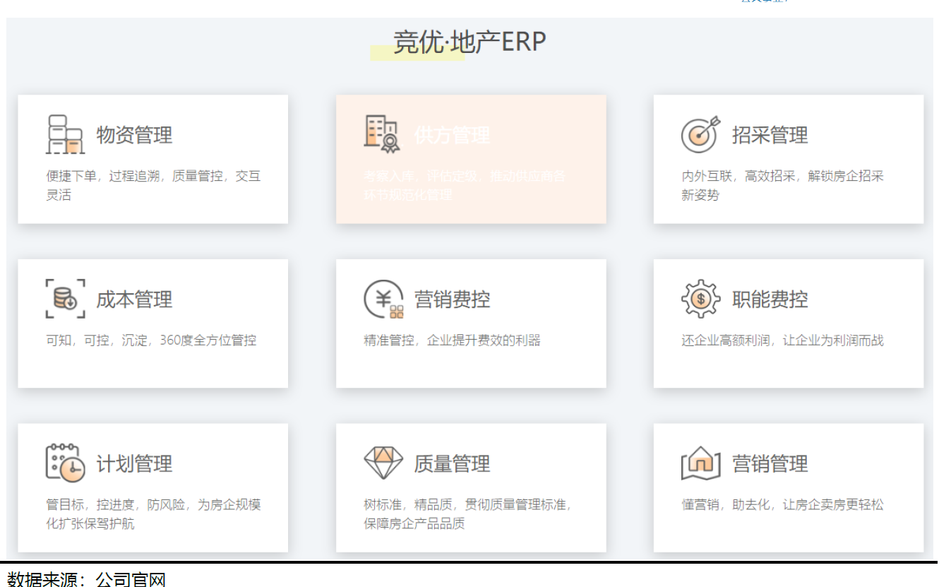 传统企业管理软件厂家,有跨国型企业SAP、竞优软件,前者是全行业的企业管理软件服务提供商,后者则专注于地产系统软件。SAP先发优势明显,并且在财务等模块上也有覆盖。其他国内的ERP服务商还有爱德数智、盟拓。前者擅长投资、设计、计划运营等模块,在$万科A(000002)$、$保利地产(600048)$等大型房企落地较多,而在销售、成本、采购等管理系统的应用较少,与明源云各有侧重,同时,爱德数智产品尚未实现SaaS转型; 后者服务地产行业为主,兼而服务医疗、零售、制造业等行业,当前卫600人左右规模,与明源云有体量上的差距。