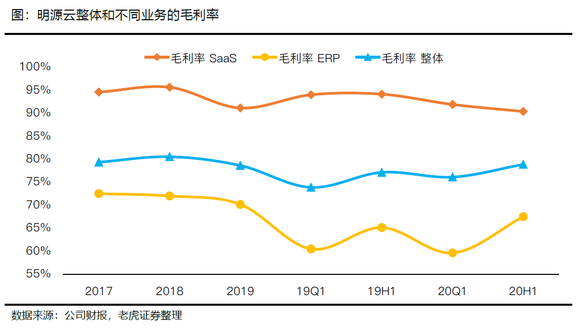 同期SaaS产品销售收入分别为1.80亿元、3.29亿元及5.10亿元,收入的贡献在快速且大幅提升。2020年上半年收入达到3.33亿元,同比增长64.9%,占比反超ERP。2017年至2019年的毛利率分别为79.4%、80.6%、78.7%,而2020年上半年公司整体毛利率为78.9%。SaaS业务占比扩大拉显著升整体了毛利率水平。