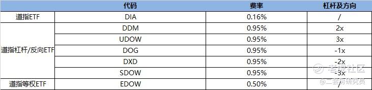 此外,道指还有对应的反向及杠杆ETF,包括DOG、DDM、DXD、UDOW、SDOW等。