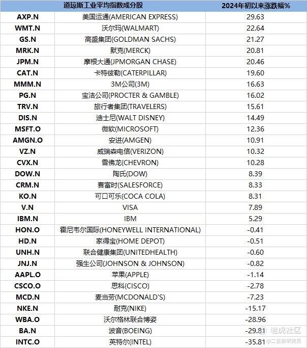 截至最新,道指30只成分股及年初以来涨幅如下: