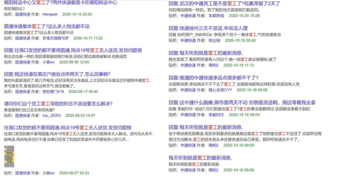 与双十一剁手战报一并发酵的,还有快递业**的传闻。截至10月28日,新浪微博上,#快递**#话题下有1300万阅读,1.3万讨论。在百度贴吧以“快递**”为关键词搜索,相关帖子有124174篇,10月以来的相关帖子约有500篇,涉及公司涵盖四通一达。