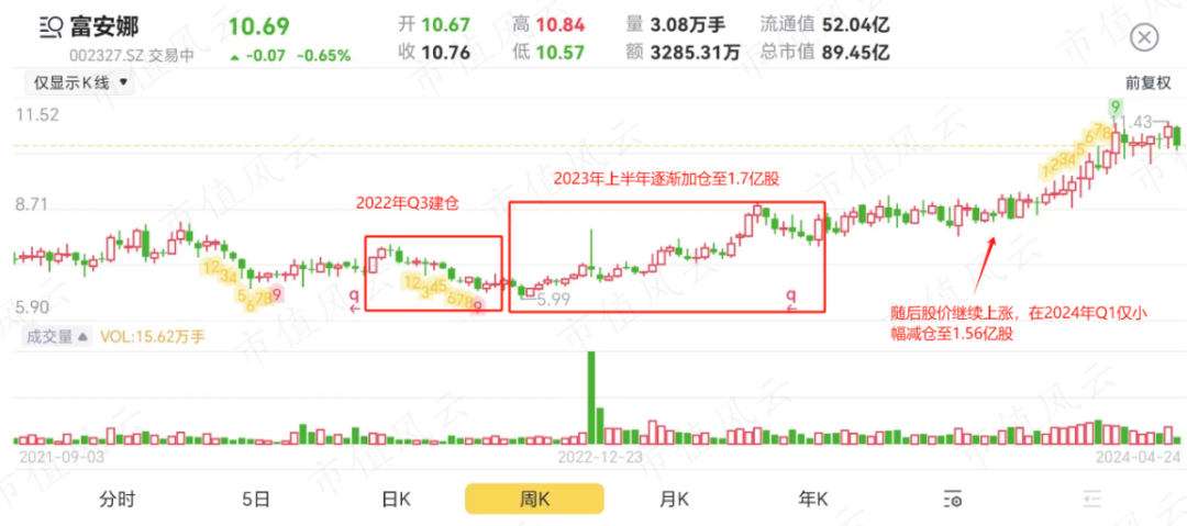 目前第四大重仓股是富安娜(002327.SZ),属于高股息股。杨思亮在2022年Q3建仓1亿股,随后在2023年上半年的股价上涨中增加至1.7亿股,在2023年下半年至今年一季度仅小幅减仓至1.56亿股。