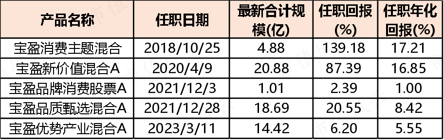 管理时间最长的是宝盈消费主题混合(003715.OF),任职回报率达139.2%,复合收益率达17.2%。而宝盈优势产业混合(A类001487.OF,C类012771.OF)在2023年3月才接手,任职回报率也有6.2%。