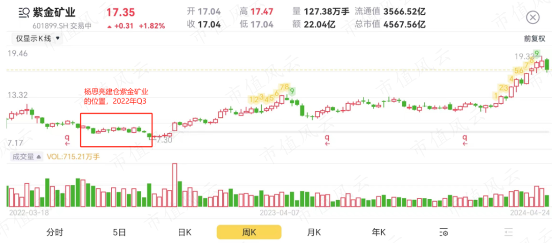 同时在2022年Q3建仓的还有第五大重仓股紫金矿业(601899.SH),从2022年Q3至今年4月19日,股价也累计上涨了1.4倍。