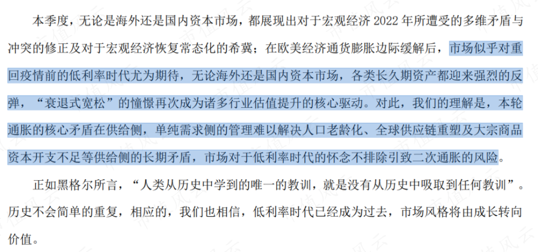 2023年一季度,在市场集体狂欢ChatGPT,疯狂炒作小盘股、垃圾股,中金甚至预期国内通胀将起时,杨思亮在季报中明确表示不看好低利率时代再临,并且强调“低利率时代已经成为过去,市场风格将由成长转向价值。”