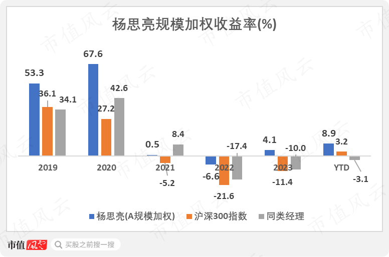 杨思亮不仅能在2019-2020年创造不错的收益率,在2022年仅亏损6.6%,2023年还小幅盈利4.1%。