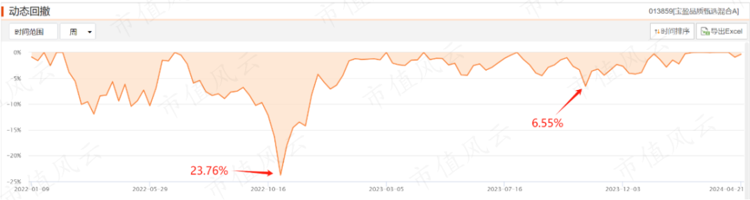 宝盈品质甄选混合的最大回撤是同一时间的23.8%,2023年至今A股的波涛汹涌对基金都没太大影响,回撤最多仅到6.5%。