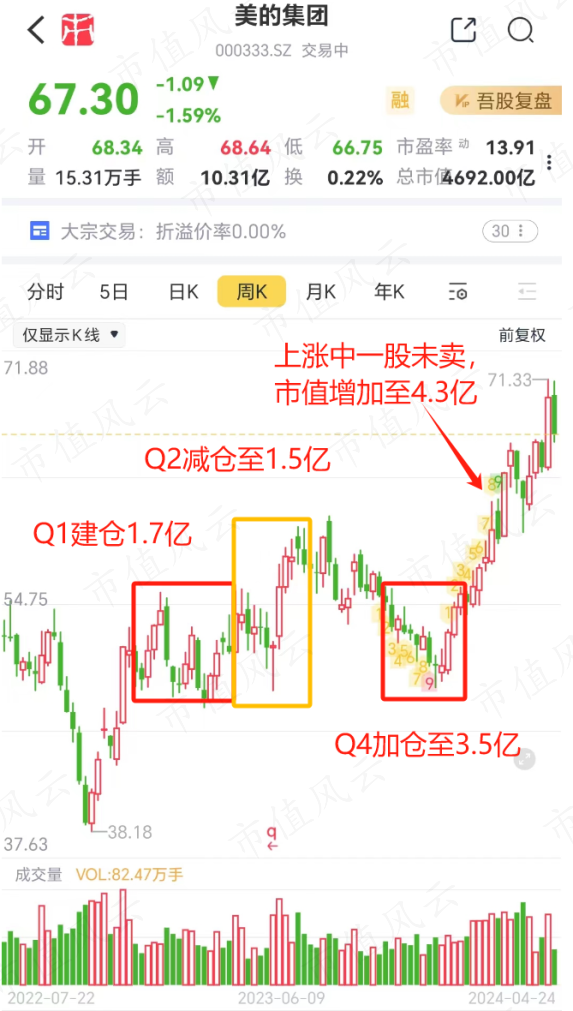 就以目前第一大重仓股美的集团(000333.SZ)为例,他在2023年Q1买入1.7亿元市值,Q2随着股价上涨减仓至1.5亿市值,随后在Q4股价显著回落时大幅加仓至3.5亿市值,今年至今在美的集团上收益率超过23%。
