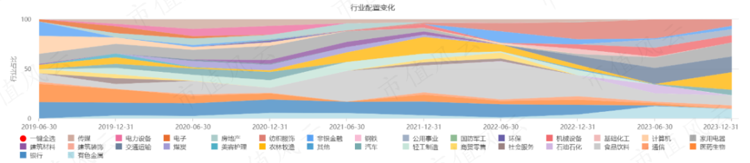 在选股标准上,杨思亮主要是自下而上的逻辑,在行业配置上相当分散,仅在2022年6月曾重仓食品饮料,仓位比例达到38%,随后又快速回落至不足10%。