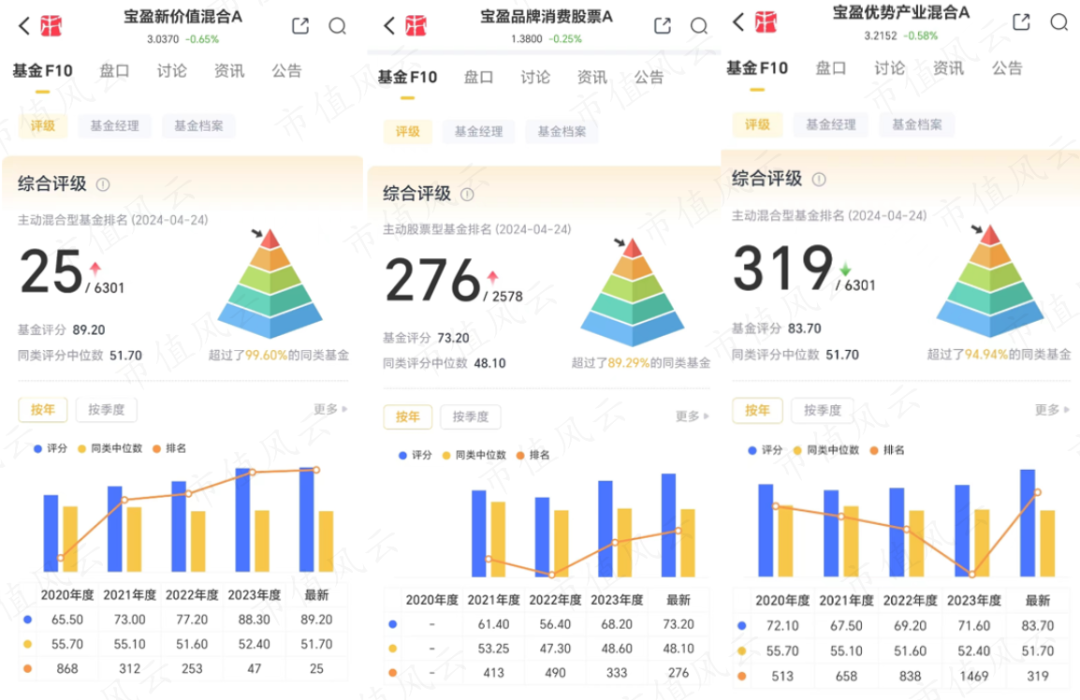 在新版“吾股”基金评级中,规模最大的宝盈新价值混合的评分最高,位于主动混合型基金的25名,超过99.6%的同类基金。其余基金的排名也都处于上升期。
