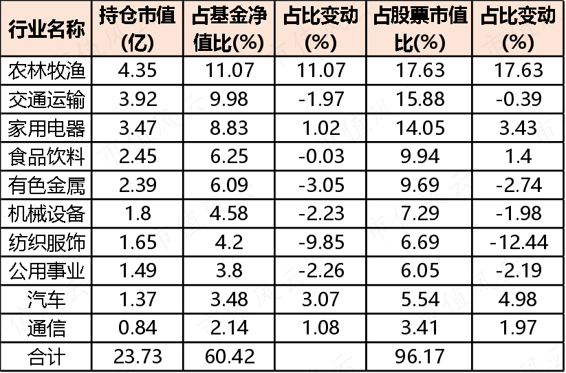 在2023年末,杨思亮的第一大重仓板块是农林牧渔,占基金净值比例仅11.1%,其次是交通运输、家用电器、食品饮料等,都是非常传统的行业。