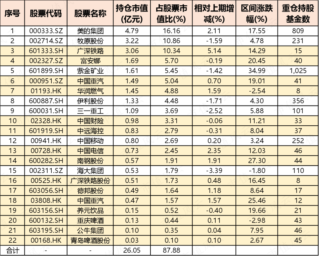 表格中标浅黄色的股票是重仓持股公募基金数低于100家的公司,可以理解成这些公司均不在公募主流配置范围内,而这样的公司足足有15家,占比达到68%。