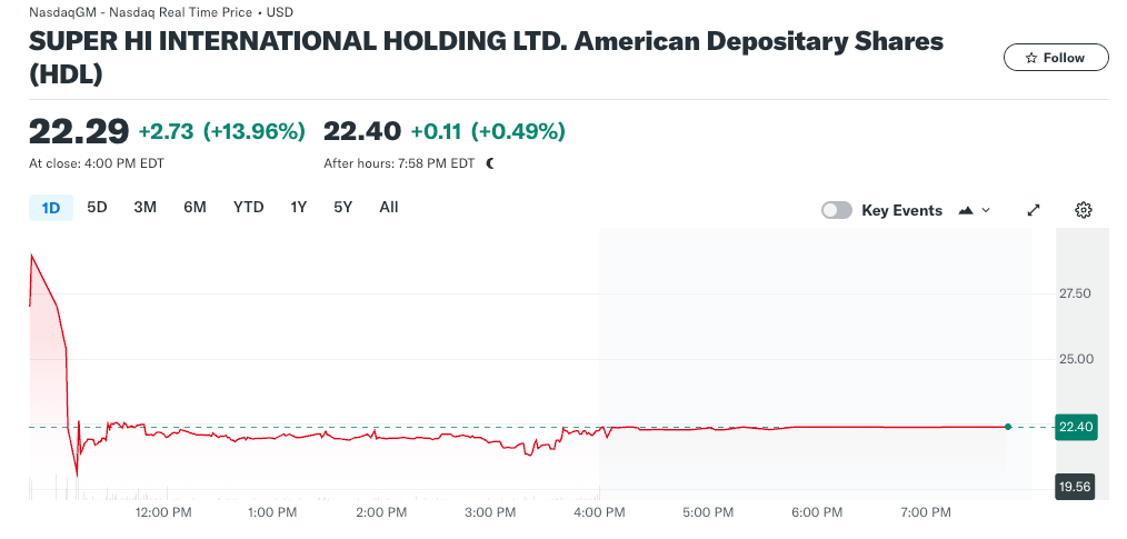 美东时间5月17日周五,海底捞旗下子公司特海国际以股票代码HDL在纳斯达克上市,开盘价高达27美元,比IPO发行价19.56美元高出38%。HDL股价一度冲至30美元,日内涨幅飙升至53.4%;但随后在早盘回落至19.8美元,涨幅收窄至不足1.3%。然而,随后又再次扩大到10%以上,最终以约14%的涨幅收报22.29美元。