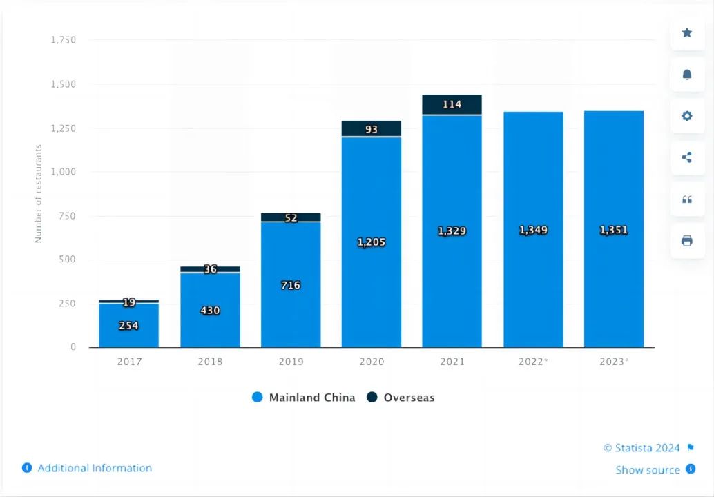 从2017年到2023年,按地区划分的海底捞餐厅数量