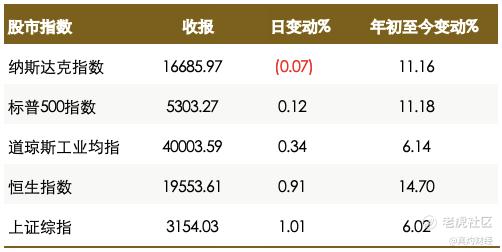 l 美国股市道指上周五首次收于40000点关口上方,其他股指周线录得上涨,因数据支持美联储今年降息的预期。美元兑主要货币回落。美国公债收益率上涨,投资者等待有关美联储今年降息的线索,而即将公布的最近一次政策会议的记录可能给出新的信息。油价收高,布油价格三周来首次录得周线涨幅。金价上涨,白银突破30美元关口,创下11年新高。 $恒生指数(HSI)$