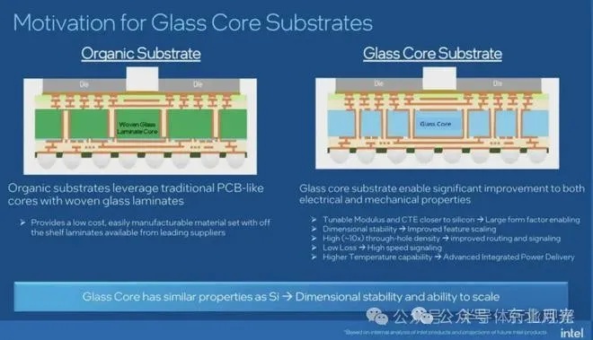 在这样的背景下,业内公司开始致力于探索有机基板的真正替代者,寻求一种能与大型芯片完美融合的基板材料。尽管这种材料在最高级别的需求上可能无法完全替代CoWoS或EMIB技术,但它却能够提供比现有有机基板更出色的信号传输性能和更密集的布线能力。