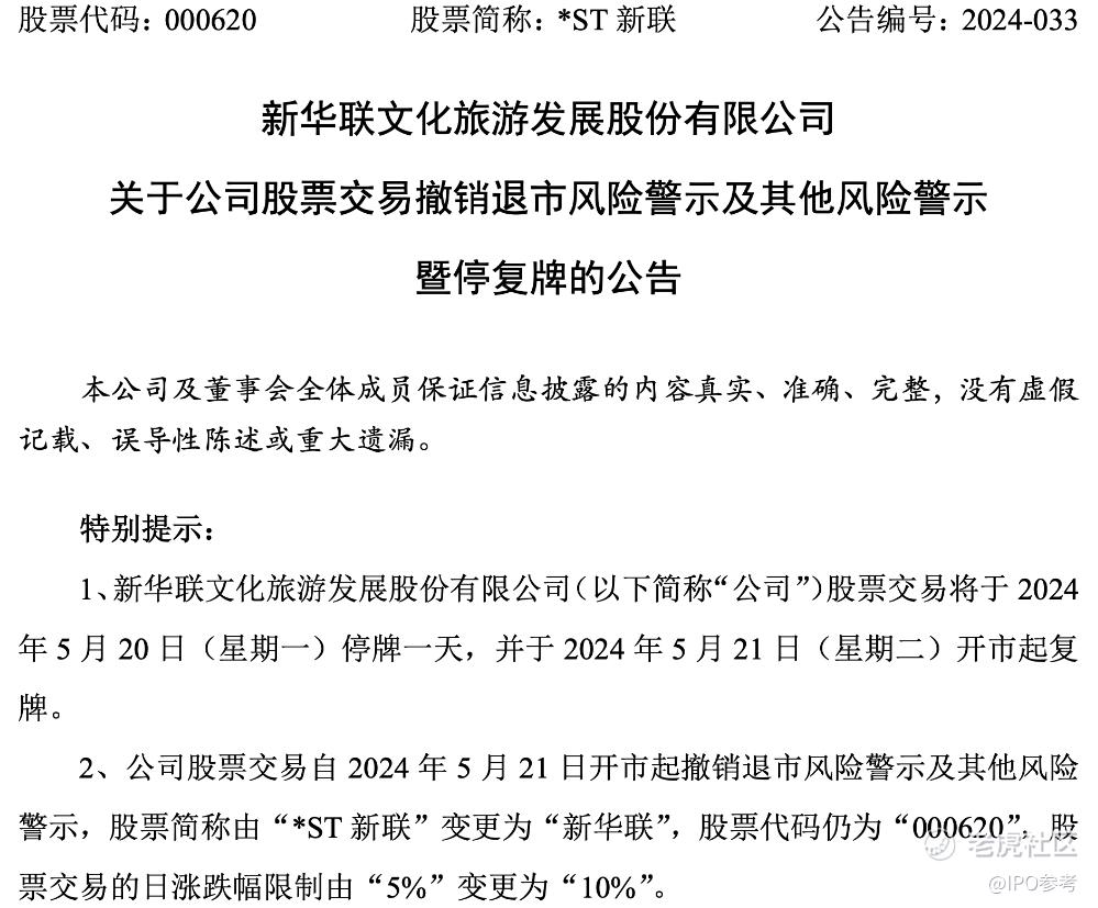 是个好事儿 $*ST新联(000620)$ 【*ST新联:5月21日起将“脱星摘帽”】*ST新联公告,公司股票交易将于5月20日停牌一天,5月21日开市起复牌,并撤销退市风险警示及其他风险警示,股票简称由“*ST新联”变更为“新华联”,股票交易的日涨跌幅限制由“5%”变更为“10%”。