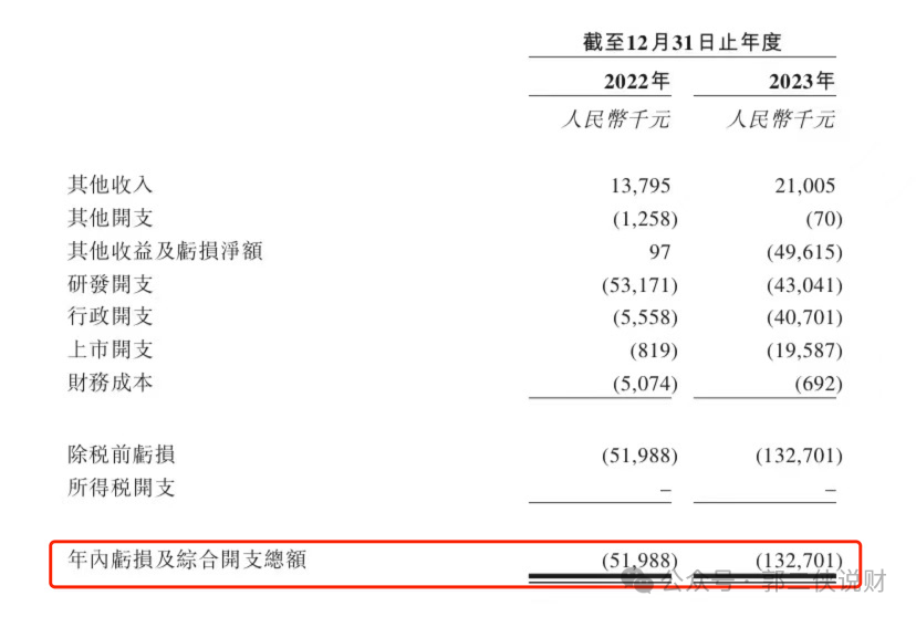 财务数据显示,在过去的2022年和2023年,盛禾生物未有主营业务收入;相应期间的研发开支分别为人民币5317万和 4304万元;相应期间的净亏损分别为人民币5198.8万和1.32亿元。