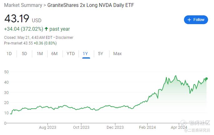 规模最大的英伟达杠杆ETF是 $GraniteShares 2x Long NVDA Daily ETF(NVDL)$ ,两倍做多英伟达股价。今年以来,随着英伟达股价大涨,这只ETF吸金超过10亿美元,过去一年涨幅超370%。