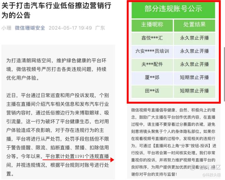 微信平台也紧随其后,发布了打击汽车行业低俗擦边营销行为的公告。平台通过巡查和用户投诉发现,部分主播通过低俗行为博取眼球,破坏了平台健康生态,对用户体验造成不良影响。对于违规行为,微信平台将进行从严处罚,包括警告、限流、禁播等措施。