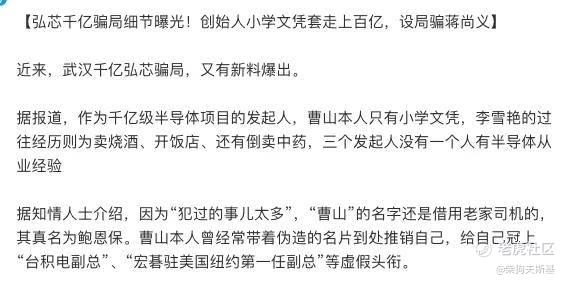 当所有的梦冷却后,有人说,武汉弘芯这家公司的发起人之一曹山本是小学文凭,另一位李雪艳过去是卖烧酒、开饭店、倒卖中药的,然而就是这样一个创始背景,短短时间内,就吸收了大百亿的投资款。