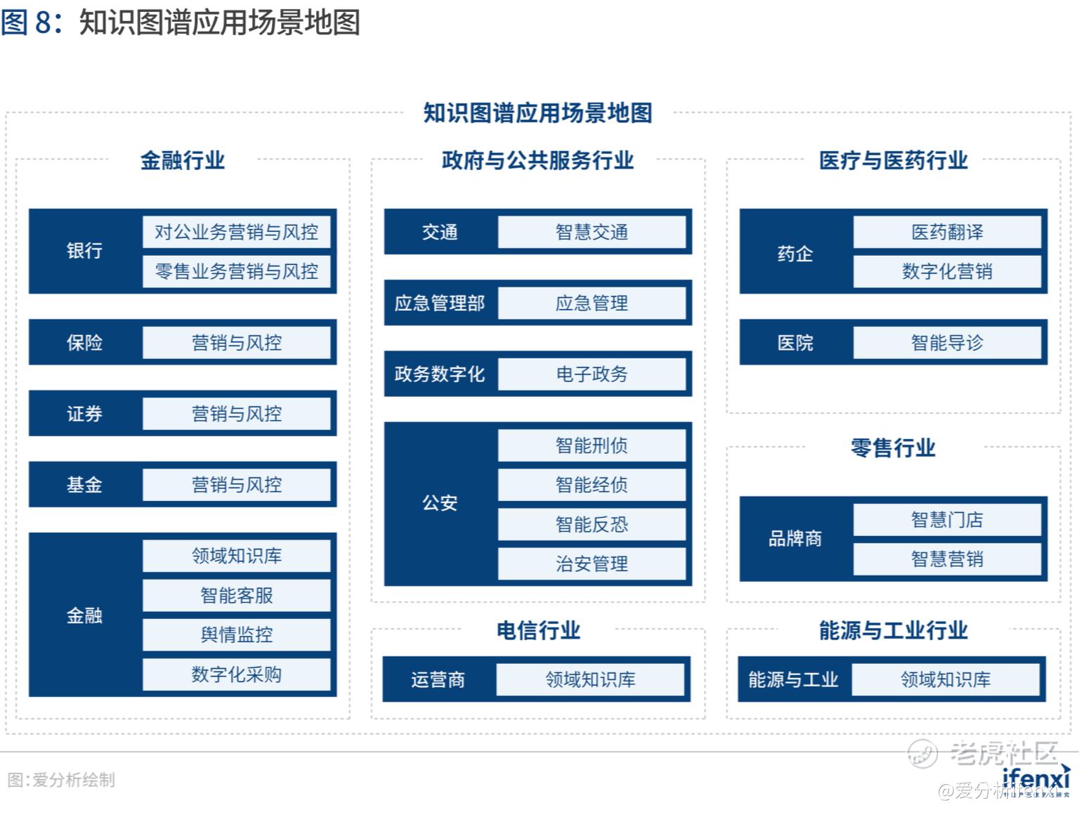 爱分析基于对国内知识图谱厂商的调研,准确定义了23个知识图谱技术的应用场景,涵盖金融、政府与公共服务、电信、医疗与医药、零售、能源与工业等六大行业。本报告应用场景只选取具有较强行业属性的应用场景进行研究分析,并没有穷举知识图谱所有应用场景。