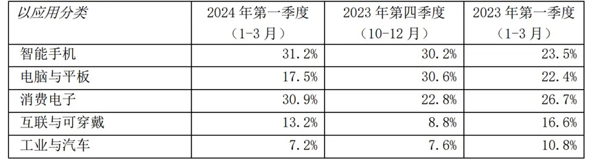可以看到,其来自智能手机客户的营收占比,从2023年一季度的23.5%,提升至当前的31.2%。据市场调查机构Counterpoint发布的数据,全球智能手机市场在2024年第一季度的出货量达到2.969亿部,同比增长6%。其中,三星重夺市场份额第一,华为在中国市场重返第一。中国手机厂商在全球市场占比增加,但收入仍低于三星和苹果。