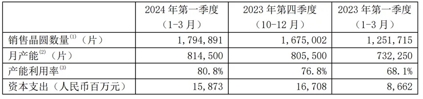 2023年,中芯国际的晶圆销售量(约当8英寸)为587万片,折合月产能达到80.6万片,年平均产能利用率为75%。2024年一季度,中芯国际的月产能为81.45万片晶圆,产能利用率为80.8%,环比提升了4个百分点,同比则提升了12个百分点,可见,随着下游需求放量,其产能利用率得到明显改善(表3)。