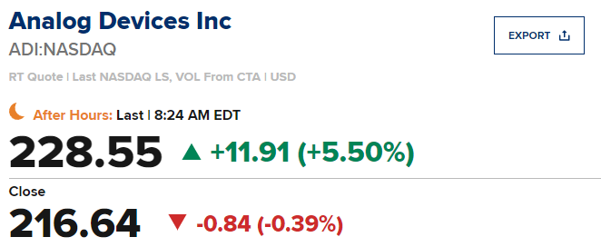 Analog Devices(ADI)第二季度每股收益为1.40美元,比市场预期值1.26美元高出0.14美元。营收同比下降33.8%至21.6亿美元,市场预期值21.1亿美元。该公司上调了第三季度业绩指引,预计每股收益为1.50美元+/- 0.10美元,相当于1.40- 1.60美元,市场预期值1.34美元。预计第三季度营业收入为22.7亿美元,上下浮动1亿美元,相当于21.7 - 23.7亿美元,市场预期值21.6亿美元。