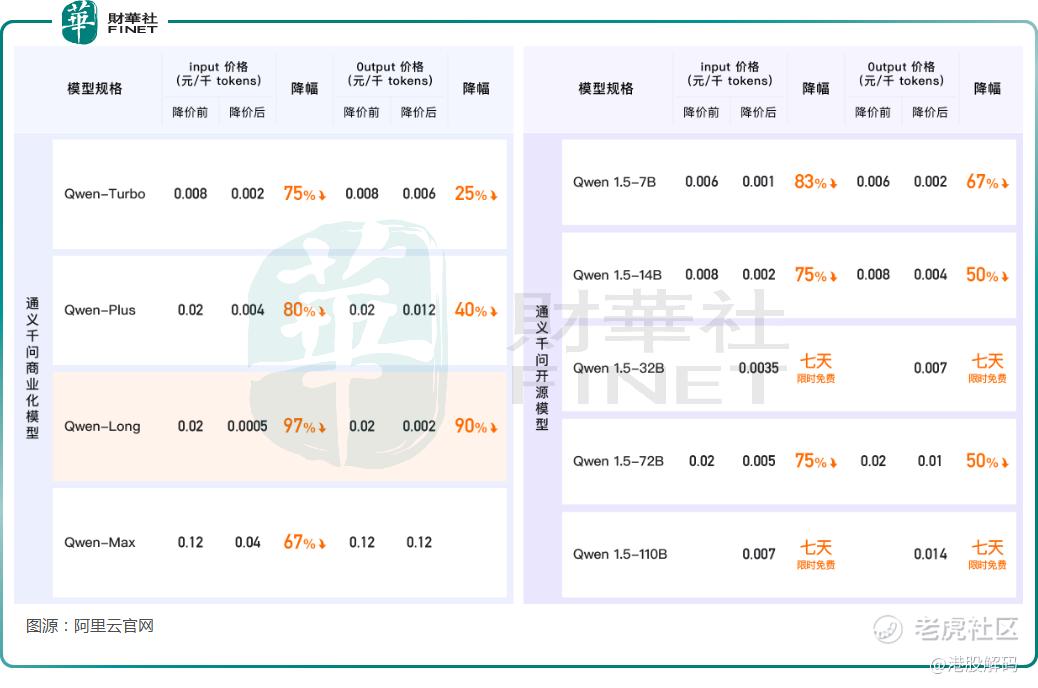 随即,在5月21日,阿里云宣布通义千问大模型降价,其中GPT-4级主力模型Qwen-Long降价幅度达到97%,API输入价格从0.02元/千tokens降至0.5厘/千tokens。这意味着用户以1元钱可以买200万tokens,相当于5本《新华字典》的文字量。