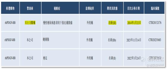 PDGF是血小板在损伤后分泌的生长因子之一,公司拥有7款PDGF候选产品,主要适应症都是“伤口愈合”的相关领域,也有关于干眼症、脱发、胃溃疡等的临床前研发项目。其中两款核心产品,适应症为烧烫伤的Pro-101-1和治疗糖足的Pro-101-2,都是重组人血小板衍生生长因子-BB(rhPDGF-BB)类药物,且均处于Ⅱ期临床阶段。