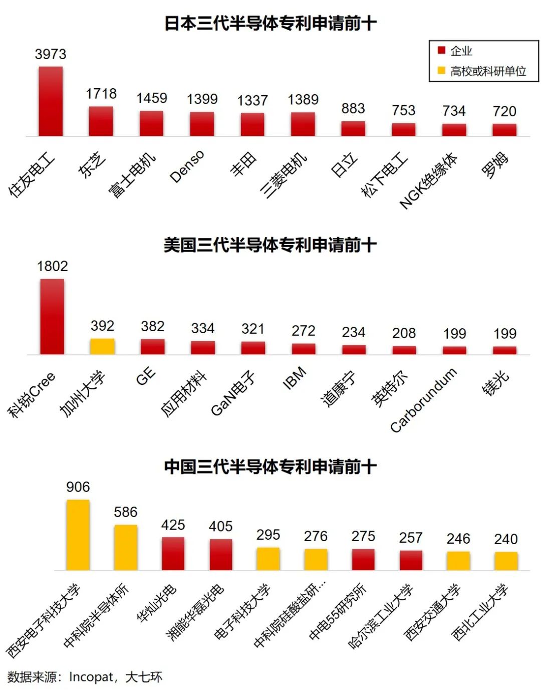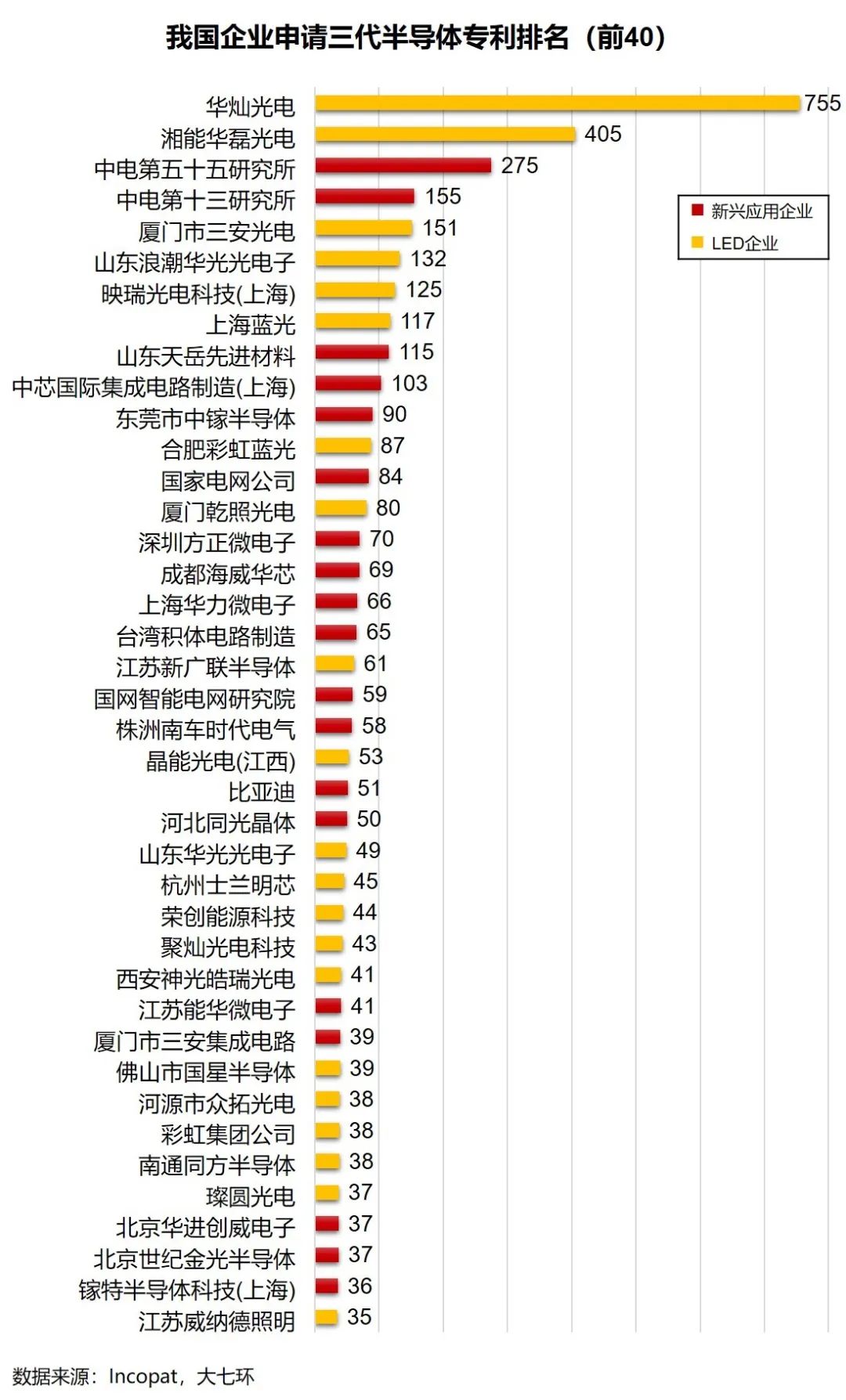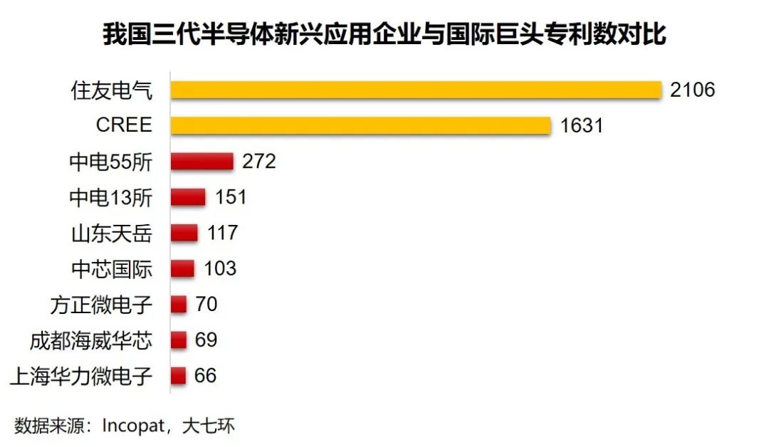 我国前20新兴应用企业的专利合计小于1600件,不及日本排名第一的住友电工(2106件),也小于美国第一的Cree(1631件)。