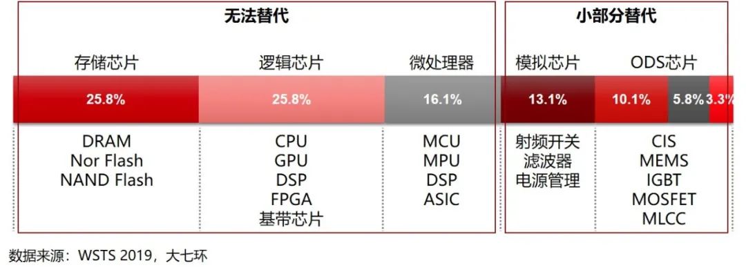 根据WSTS 的数据(2019年),在全球市场中,存储芯片、逻辑芯片、微芯片、绝大部分模拟芯片、超一半的光电子芯片和传感器占据了超90%的市场份额,而这些芯片几乎不能被三代半导体替代。