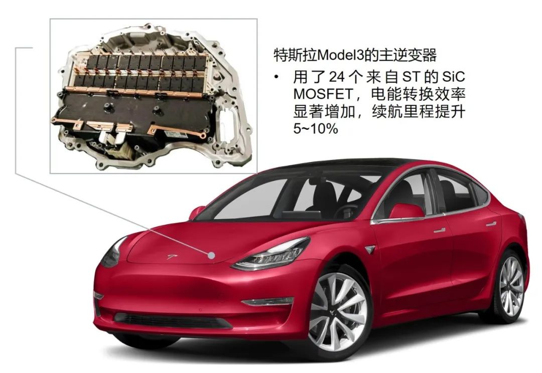 如特斯拉在Model 3中大量使用SiC MOSFET替代传统Si IGBT,电能转换效率显著增加,提升5~10%的续航里程。