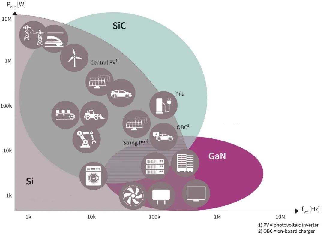 目前看,SiC主要在高压、大功率的电力电子领域替代硅,GaN主要在低压电力电子和高频射频器件中替代硅。