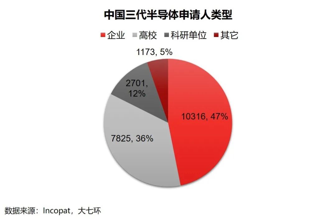 在我国三代半导体专利中,高校和科研单位的专利申请占比分别为36%、12%,合计58%,大于企业的47%申请份额。其中仅4.9%(510/10568)的专利转移给了企业。