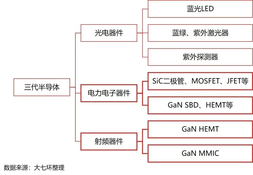 相对一代、二代半导体,三代有大带隙、高熔点、高热导率等特性,仅可能在模拟芯片、分立器件和光电芯片领域部分替代硅,例如模拟芯片中的GaN功率放大器,分立器件中的SiC二极管和MOSFET,光电芯片中的GaN蓝光LED。、