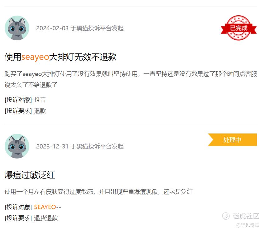 无独有偶,几个月前,也有消费者表示,SEAYEO昔又大排灯没有美容效果要求退款。而官方客服最初的解释是使用时间不够长,需要坚持使用。后面却又说超时了不能退款。