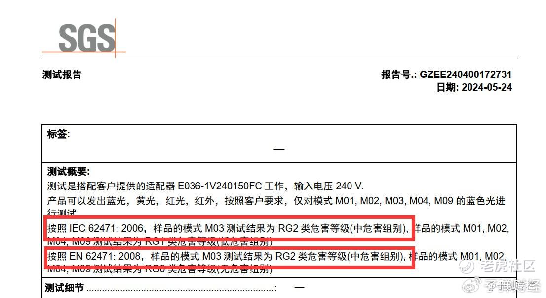 报告显示:SEAYEO昔又大排灯PRO蓝光表现不合格,为RG2属于中危害组别,使用该产品0.25s以上会产生视网膜蓝光危害及视网膜热危害。