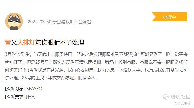 例如,据黑猫投诉平台的一条信息显示,SEAYEO昔又大排灯致角膜损伤。该消费者如此反馈,收货当天晚上,就戴上眼罩使用,但是照射后发现眼睛难受不舒服,觉得可能晃到了,以为睡一觉醒来就能好了。