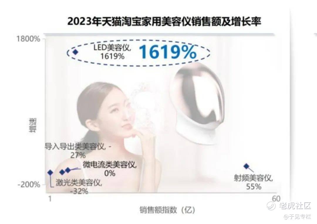 而根据凯度和TMIC推出的《2023年LED美容仪行业趋势白皮书》,在2023年天猫淘宝家用美容仪销售情况中,LED美容仪的销售增长率高达1619%,射频美容仪为55%,激光类美容仪为32%,导入导出类美容仪为27%。