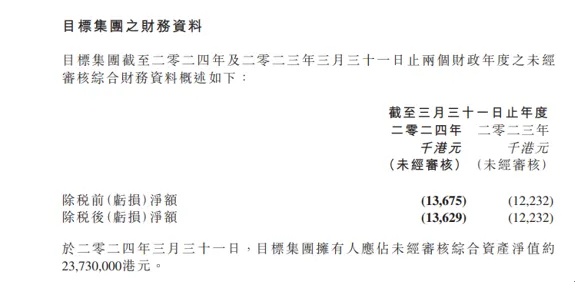 目标公司由中国农产品(00149.HK)于2013年成立,于江苏省淮安市从事农产品及副产品批发市场营运。目标集团自2021年以来一直处于亏损状态。就说明而言,目标集团截至2022年、2023年及2024年3月31日止三个财政年度的未经审核综合亏损净额分别约为2290万港元、1220万港元、1360万港元。